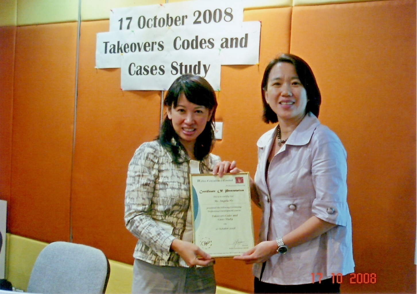 何律師於2008年10月17日為一個主題為”收購守則及個案研宄”的專業進修研討會擔任主講者。